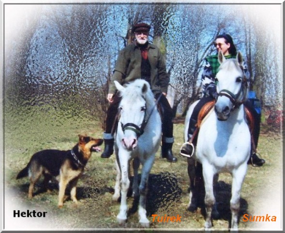 Po przeprowadzce na wieś pierwsza w mojej stajni była klacz HANA rasy konik polski. Do towarzystwa Hani na wakacje przyjechały dwa siwe konie Sumka i Turek. Jak siwki wróciły do pracy (były końmi filmowymi) zakupiłam do Hani młodą ciemnogniadą źrebną klacz Nutke, która dała mi ślicznego ogierka Biszkopta. Jeszcze później do mojego stada dołączył kasztan Otok.