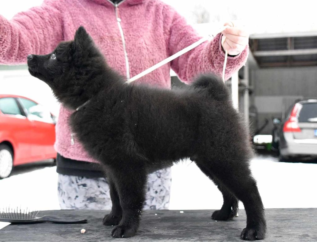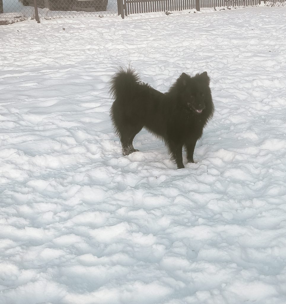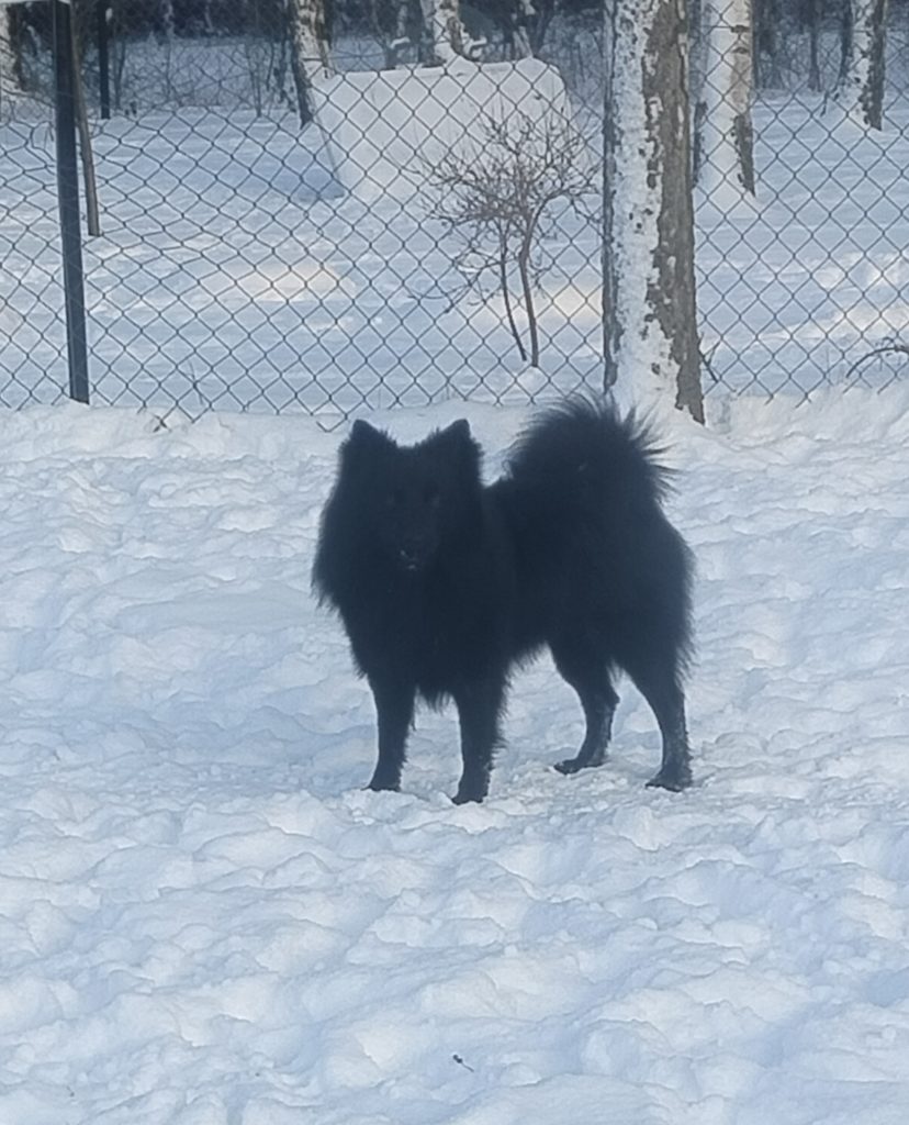 W marcu 2024 r do hodowli zawitał przystojniak z Finlandii w kolorze czarnym jak smoła. To pierwszy samiec szpica dużego czarnego z zupełnie obcymi genami bardzo potrzebny w mojej hodowli. Zauroczyła mnie jego doskonała budowa i perfekcyjny ruch i kolor futra, czarny bez przebarwień, badania genetyczne barwy ptowierdzają, ze Erni przekaże ten gen swoim dzieciom.